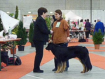 Richterbericht von Frau E. Clerc: Rassetypische Hündin mit femininem Kopf und Ausdruck, g. Knochen, vorzüglich gewinkelt, geschl. Gebäude, raumgreifende Bewegung, vorzügliche Haarkondition.