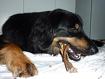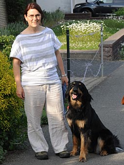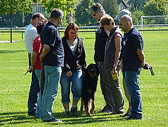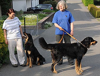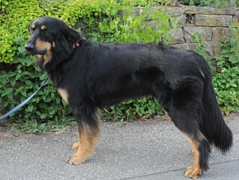 2,5 typvolle Hündin, gute Größe und Format, feste Rückenlinie, korrekte Winkelungen und Stellung, gute Rippenwölbung, Kopf typisch, sehr gute Fellqualität. In der Bewegung regelmäßig und frei, freundliches, ausgeglichenes Wesen. 2,7 Jahre alte, ideal große, gestreckte, knochenstarke sm Hündin. Flammende Marken an Kopf und Läufen, etwas helle an der Brust. Hündinnenkopf mit korrekt angesetztem und getragenem Behang, mittelbraunes Auge, vollständiges Scherengebiss, vorzügliche Pigmentierung. Brusttiefe und -breite in jeder Beziehung korrekt. Gerader, fester Rücken mit sanft gerundeter Kruppe. Korrekt angesetzte, lange Rute, in der Bewegung geschwungen getragen. Gerade gestellte Läufe mit vorzüglichen Winkelungen. Fließende Bewegungsabläufe mit sehr gutem Schub aus der Hinterhand. Sehr guter Ernährungszustand. Freundlich-ruhige Hündin, vorzügliche gesundheitliche Verfassung. |