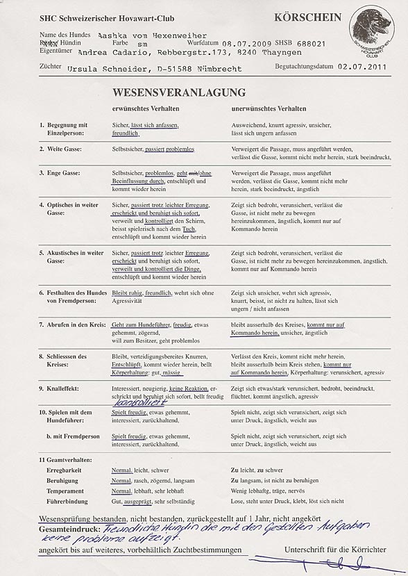 Im Alter von 1 Jahr und 7 Monaten hat Aashka in der Zwischenklasse mit V1 ihre ersten Titel errungen: BOB (tagesbester Hovawart) sowie CAC (Certifikat d'Aptitude au Championnat = Anwartschaft für ein nat. Schönheits-Championat) und CACIB (Anwartschaft auf das Internat. Championat der FCI) Wir gratulieren ganz, ganz herzlich! Richterbericht von Frau A. Grund: |