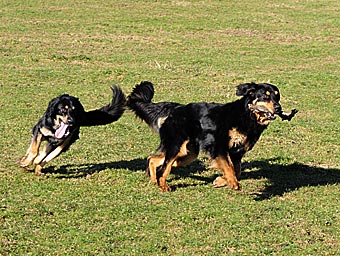 22 Monate alter großrahmiger kräftiger sm-Rüde, mit typischem Kopf, etwas hinten angesetztem Behang, mittelbraunen Augen, vollständigem Scherengebiss und offenen Lefzen, Gebäude ist gestreckt, die Rute ist in Ordnung, die Hoden sind vorhanden, das kräftige Deckhaar ist ausreichend lang und leicht gewellt, die mittelblonde Markenzeichnung ist vollständig, an den Vorderläufen etwas überzeichnet. Ein leichter Brillenanflug ist erkennbar. Der Rüde hat einen kleinen weißen Brustfleck. Die Läufe sind gerade und korrekt gewinkelt, der Rüde zeigt einen ausgreifenden Trab mit hochgeschwungener Rute, im Ring ist er interessiert und freundlich.