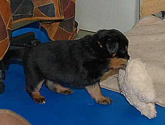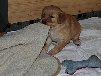 Immer öfter sieht man, wie die Welpen Spielzeug schütteln und umher tragen.