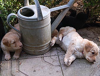 Die Welpen haben ihren Lieblingsplatz gefunden: Nach ihren Erkundungsausflügen chillen sie unter den Buchskugeln.
