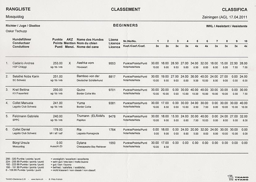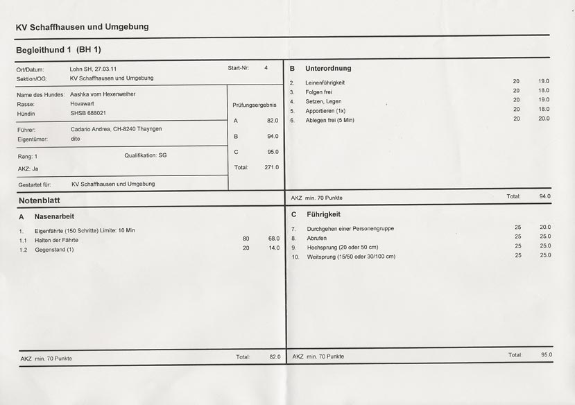Aashka geht zu einer Hundetrainerin in die Schweiz. Dort wird sie zusammen mit der Hovi-Hündin Batja vom Haerdlewald und einem jungen Rottweiler-Rüden leben. Batja geht hundesportlich gerade in Pension und Aashka soll nun ihre Nachfolge antreten. Geplant ist eine Ausbildung in BGH (entspricht in etwa der deutschen VPG-Unterordnung incl. Fährte) und Obedience. Jubiläumsschau SHC: |
