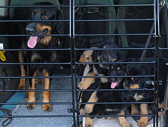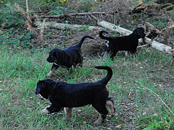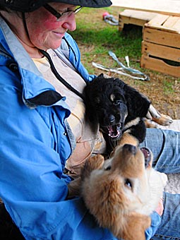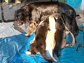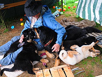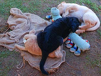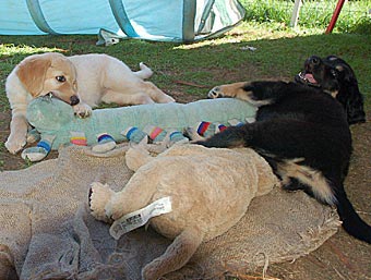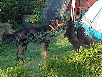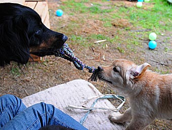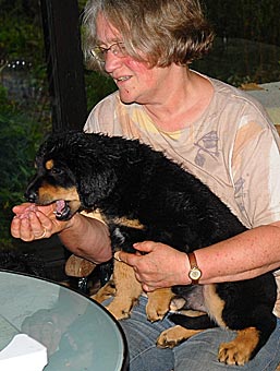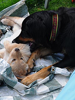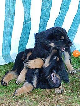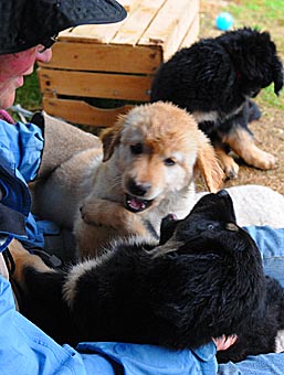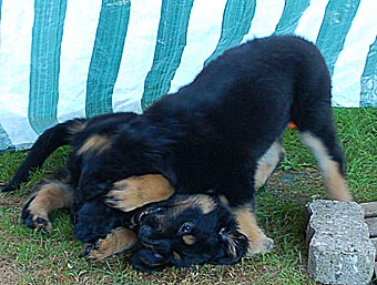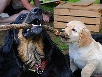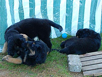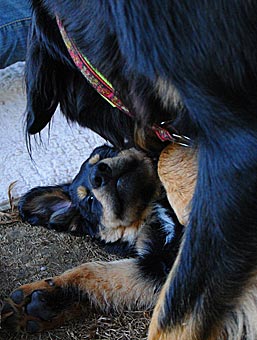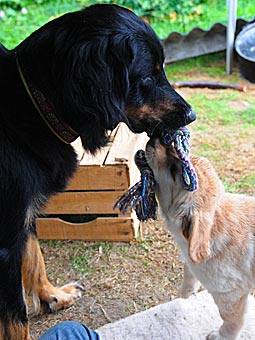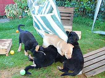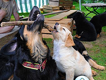 Carla pielt sehr liebevoll mit ihren Welpen, sucht sich aber auch schon mal einen heraus, um ihn zu erziehen.