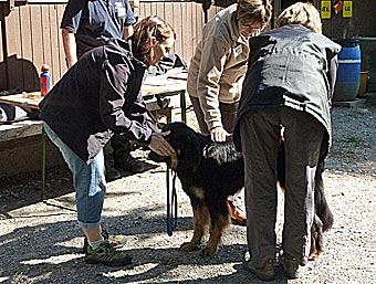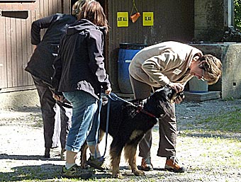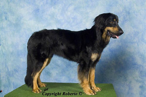2,5 typvolle Hündin, gute Größe und Format, feste Rückenlinie, korrekte Winkelungen und Stellung, gute Rippenwölbung, Kopf typisch, sehr gute Fellqualität. In der Bewegung regelmäßig und frei, freundliches, ausgeglichenes Wesen. 2,7 Jahre alte, ideal große, gestreckte, knochenstarke sm Hündin. Flammende Marken an Kopf und Läufen, etwas helle an der Brust. Hündinnenkopf mit korrekt angesetztem und getragenem Behang, mittelbraunes Auge, vollständiges Scherengebiss, vorzügliche Pigmentierung. Brusttiefe und -breite in jeder Beziehung korrekt. Gerader, fester Rücken mit sanft gerundeter Kruppe. Korrekt angesetzte, lange Rute, in der Bewegung geschwungen getragen. Gerade gestellte Läufe mit vorzüglichen Winkelungen. Fließende Bewegungsabläufe mit sehr gutem Schub aus der Hinterhand. Sehr guter Ernährungszustand. Freundlich-ruhige Hündin, vorzügliche gesundheitliche Verfassung. |