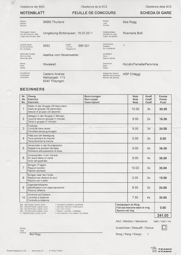 1 Monat danach erreichte sie bei ihrer 2. Obedience-Prüfung 253 Punkte und das AKZ "Obedience Beginners"