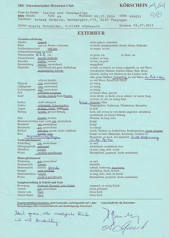 Im Alter von 1 Jahr und 7 Monaten hat Aashka in der Zwischenklasse mit V1 ihre ersten Titel errungen: BOB (tagesbester Hovawart) sowie CAC (Certifikat d'Aptitude au Championnat = Anwartschaft für ein nat. Schönheits-Championat) und CACIB (Anwartschaft auf das Internat. Championat der FCI) Wir gratulieren ganz, ganz herzlich! ![]() Richterbericht von Frau A. Grund: |
