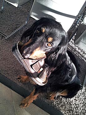 Aashka bringt ihm, nachdem sie sich bewegt haben, immer wieder mit viel Freude seine Hausschuhe gegen ein Lekerli.