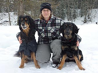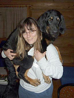 Aashka mit gut 9 Monaten. Wenn Andrea in die Hocke geht, um z.B. Batja, die am Boden liegt, zu streicheln, dann geht Aashka mit ihren Vorderpfoten Andrea auf den Rücken. Manchmal kommt es vor, dass sie dann versucht, ihr mit allen Vieren auf den Rücken zu klettern. Andrea hat es dann mal versucht, sie über die Schulter zu nehmen und aufzustehen. Aashka blieb ganz ruhig und genoss die Aussicht |