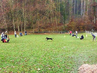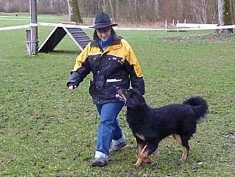 Aashka startete wie eine Rakete. Dies war eine gute Gelegenheit, den immer wieder geübten Rückruf ohne Ablenkung nun mal MIT Ablenkung auszuprobieren. Andrea rief "Cherä" (zu deutsch: Kehrt). Oh Wunder: Aashka wendete wie ein Blitz und kam, um ihre Spezialbelohnung einzufordern. Die bekam sie natürlich auch und nicht zu knapp.