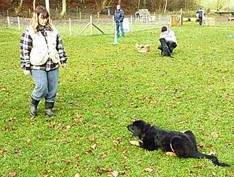 Während die Hundeführerin sich entfernte, hielt Andrea die Leine des Hundes - aber nicht fest genug. Die Leine entglitt ihr und der Hund rannte zu seiner Hundeführerin. - Aashka aber blieb brav liegen ... und Andrea bestätigte sie dafür. Nun wurde die Übung mit dem anderen Hund nochmals wiederholt und das Abrufen klappte super.