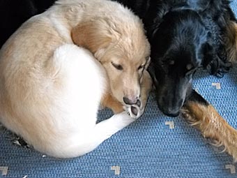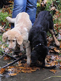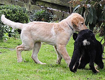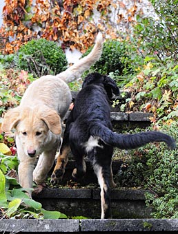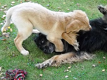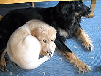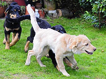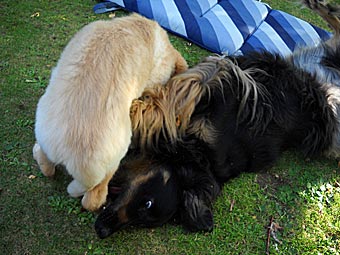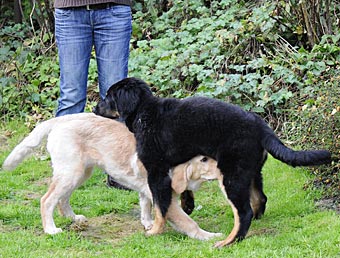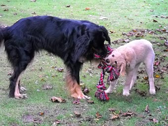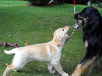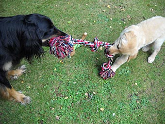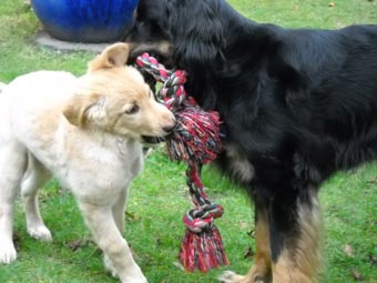 Als Alraune am Freitag zu Hause ankam, war die Begeisterung bei Jette und Alraune erst mal nicht gerade groß. Doch schon nach einer geringen Aufwärmzeit brachte Jette ihrer neuen Gefährtin ein Spielzeug. Am Nachmittag bekamen beide ein ganz neues Knotenseil - und schon taute das Eis.