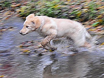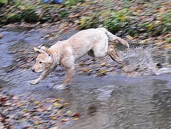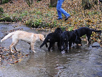 Am Mittwoch war die erste Welpenspielstunde. Alraune hat sich alle Spielgeräte neugierig angeschaut. Unter anderem gab es dort auch ein Wasserbecken mit einer Rampe davor. Alraune ist gleich die Rampe hoch und hat mit einer Pfote im Wasser gepaddelt. Bei uns hat sie ja nur die ganz flache Wasserschale kennen gelernt. Das Becken dort war aber tiefer ... und da ist sie reingeplumpst. Nachdem sie wieder 'rausgefischt' wurde, hat Alraune sich nur geschüttelt und ist kurz danach wieder die Rampe hoch gelaufen um sich das Wasserbecken noch mal genauer anzuschauen. Mutiges Mädchen! Reingefallen ist sie natürlich nicht noch mal. |