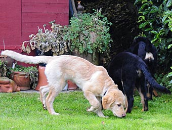 Alraune geht schon alleine kleine Runden in den Garten. Als es regnete, musste Frauchen mit Regenschirm nach draußen - kein Problem. |