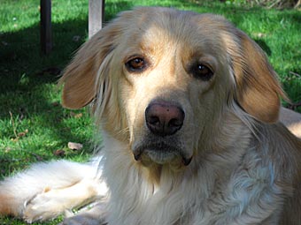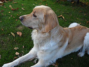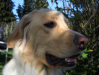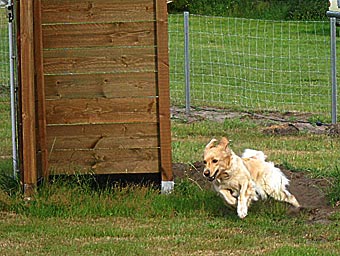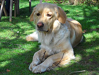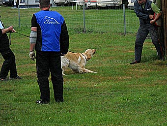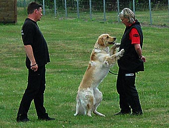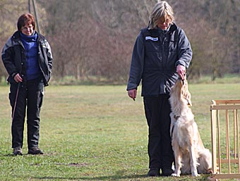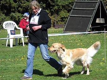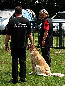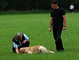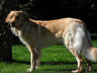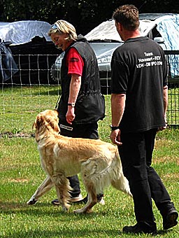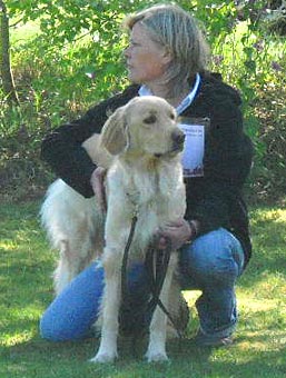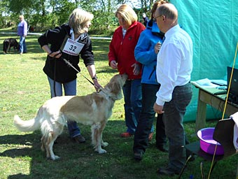 Richterbericht: Eine 21 Monate alte freundliche, großrahmige blonde Hündin von vorzüglichem Typ mit kräftigem Kopf, korrekt getragenem Behang, mittelbraunen Augen und vollständigem Scherengebiss. Sehr gute Rückenlinie. In der Bewegung zeigt sich der Hund vorne korrekt, in der Hinterhand hackeneng. Die anatomisch einwandfreie Rute von sehr guter Länge wird in Bewegung korrekt getragen. Schönes mittellanges blondes Haarkleid mit deutlichen Aufhellungen.