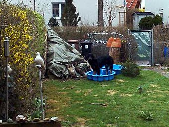 Frauchen hat Amsel schon eine Bademuschel für die heißen Sommertage gekauft.