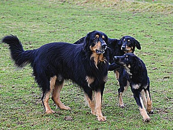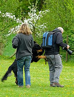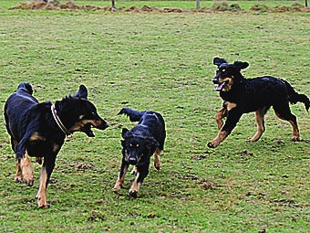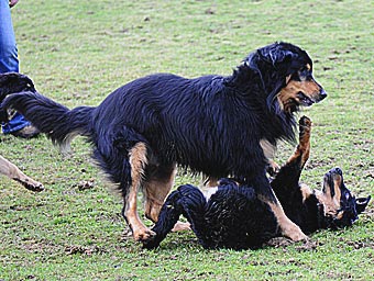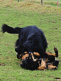 Ganz nach Hovawartart spielt Atlas mit anderen Hunden recht rauh, aber wenn diese quietschen und ihn ein wenig zurecht weisen, dann schaltet er eine Stufe runter. Hören tut er immer noch sehr gut, aber man merkt, dass Hunde für ihn im Moment das Größte sind. Da wird Frauchen schon darauf achten, dass er nicht seinem Willen freien Lauf lässt.