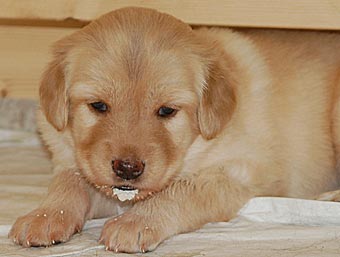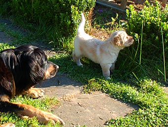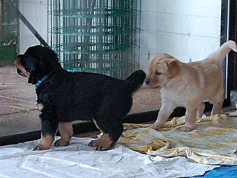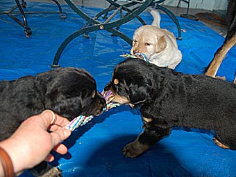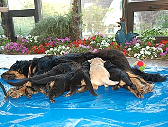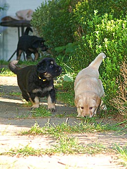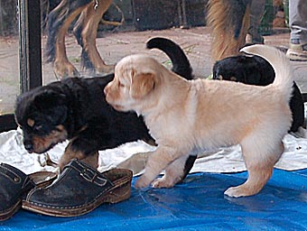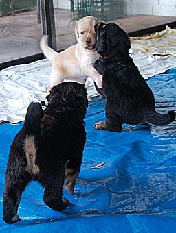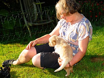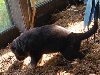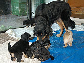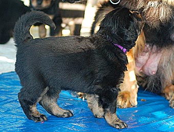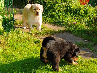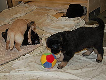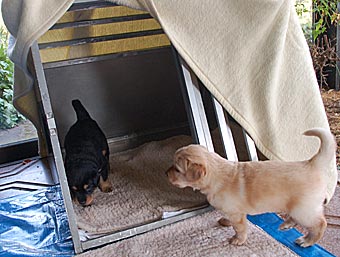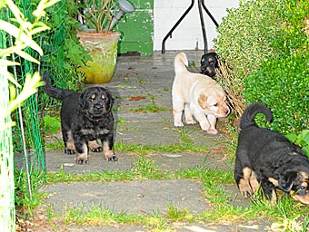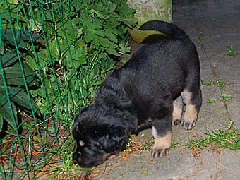 Dort gibt es ein Beet mit Erde, in dem die Welpen wichtige "Geschäfte" erledigen können. Schon bald lernen sie, dieses Beet gezielt aufzusuchen. Das ist wichtig für die spätere Stubenreinheit, denn schon in diesem Alter werden die Welpen auf den Untergrund beim Ausscheiden geprägt und behalten diese Vorliebe ein Leben lang bei.