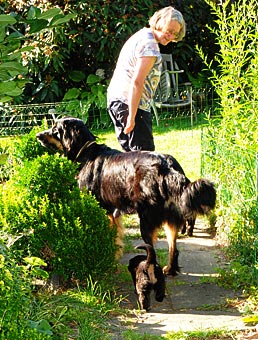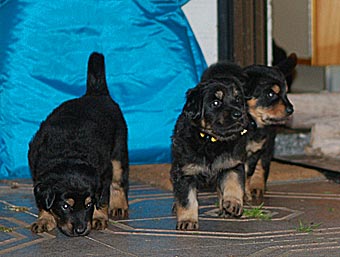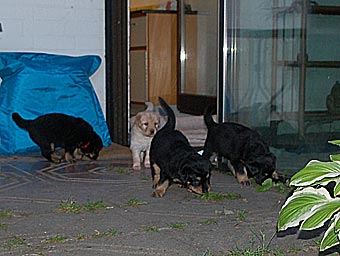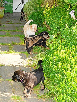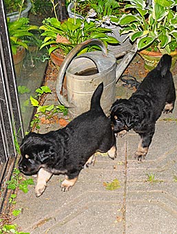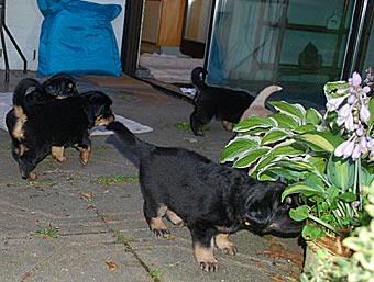 Heute haben wir den Garten für die Welpen geöffnet. Es war recht heiß und auf der Terasse neben dem Wintergarten brannte die Sonne. So verzogen sich die Welpen immer wieder in ihr kühles Welpenzimmer. Erst in der Dämmerung brachen sie zu einer kleinen Erkundungstour auf, blieben aber noch im Bereich unmittelbar neben Wintergarten und Welpenzimmer.