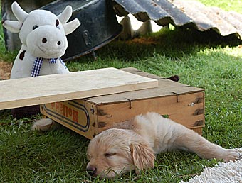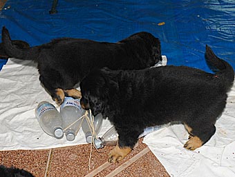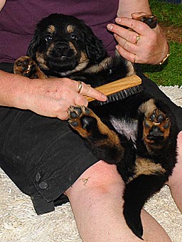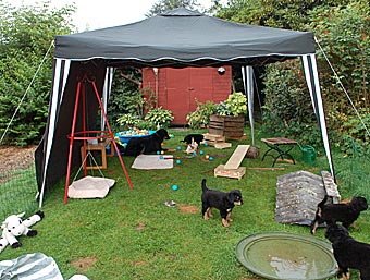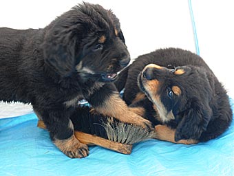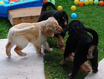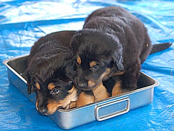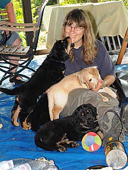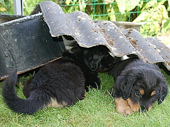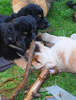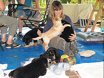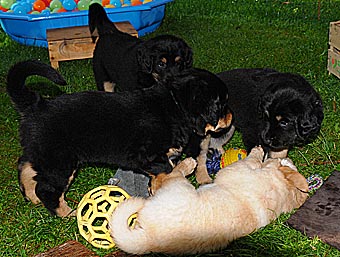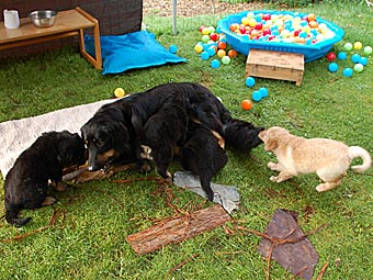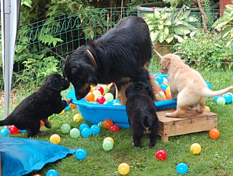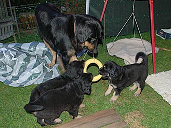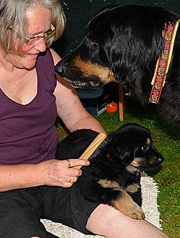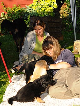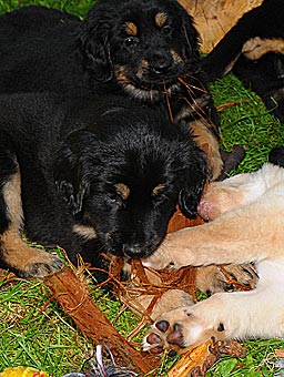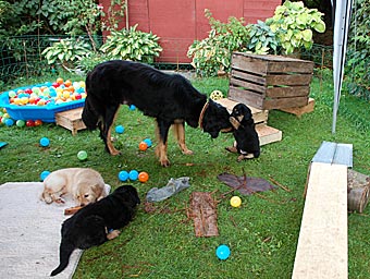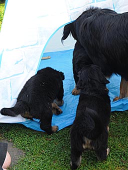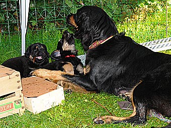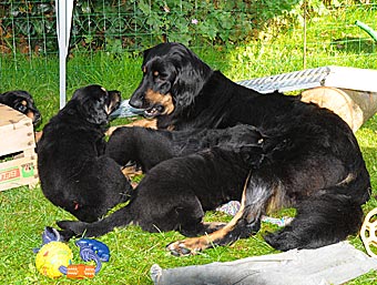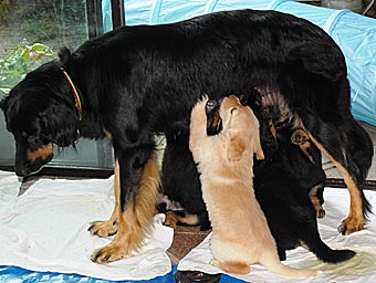 Carla säugt immer noch tapfer ihre Welpen, obwohl sie inzwischen recht grob mit ihr umgehen und die kleinen Zähnchen ihr sicher weh tun.