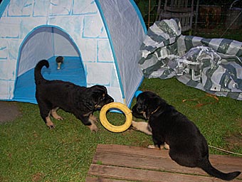 Alaune hat ein ganz besonderes Spielzeug entdeckt: ganz keck zieht sie ihrer Mama am Schwanz.