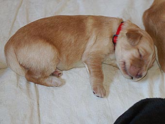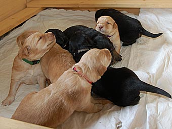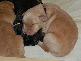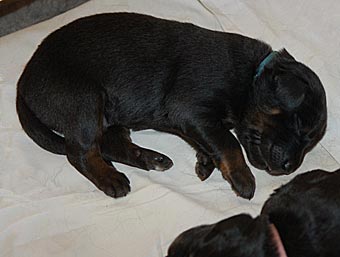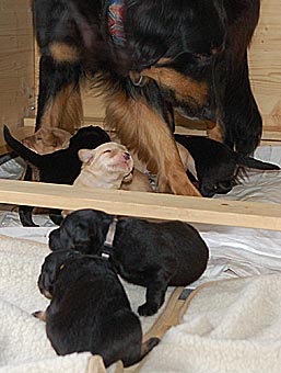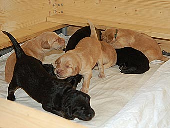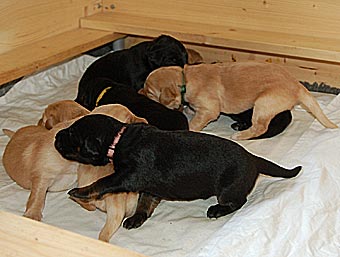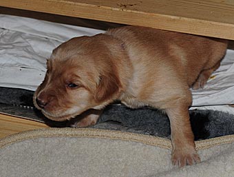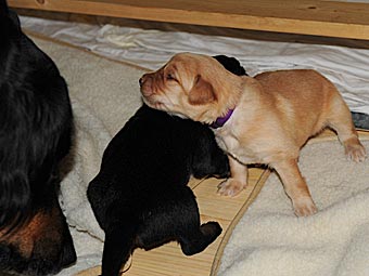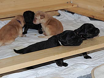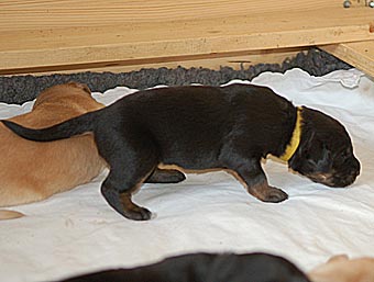 Es wuselt in der Wurfkiste, die Welpen werden immer agiler. Ihre Mobilität hat schlagartig zugenommen. Sie richten sich schon auf und versuchen, ein paar Schritte zu laufen. Aber ihr Gang ist doch noch arg schwankend ;-)) Sie wackeln auf ihren kurzen Beinchen durch die Wurfkiste und machen erste Erkundungstouren.