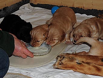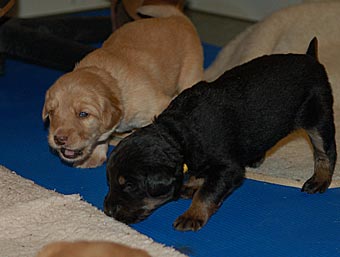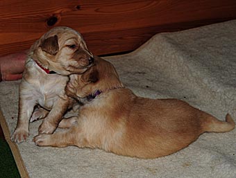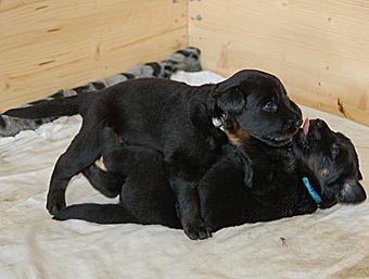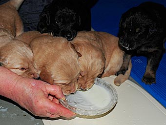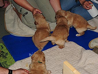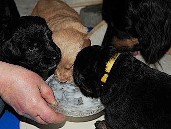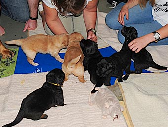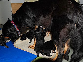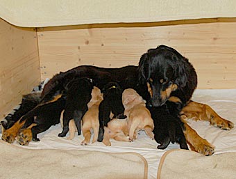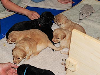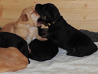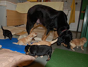 Dann gab es erst mal eine Mahlzeit bei Mama und als sie alle satt waren, schwärmten unsere Entdecker gleich wieder aus, um ihr neues Domizil weiter zu erkunden. Inzwischen war auch der Züchterpapa dabei und hat Fotos gemacht, während ich von den Welpen belagert wurde.
