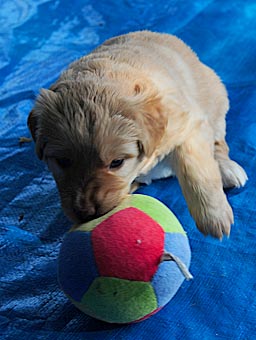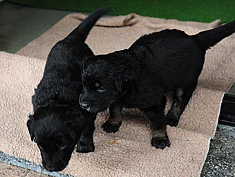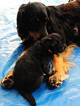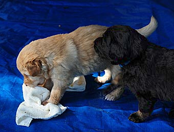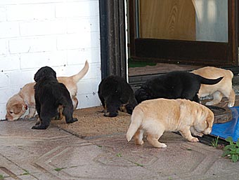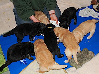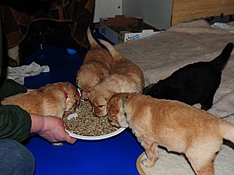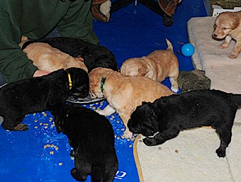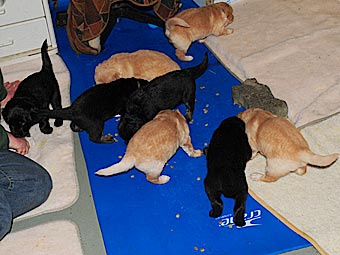 Der Futterplatz glich schon bald einem Schlachtfeld - Futter überall - in den Welpen, auf den Welpen, unter den Welpen