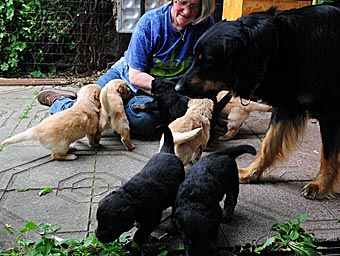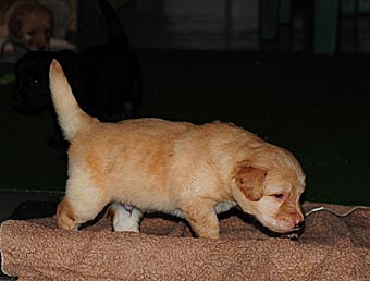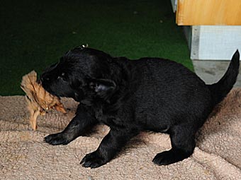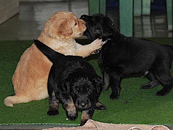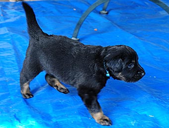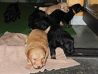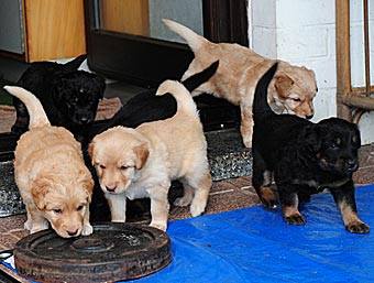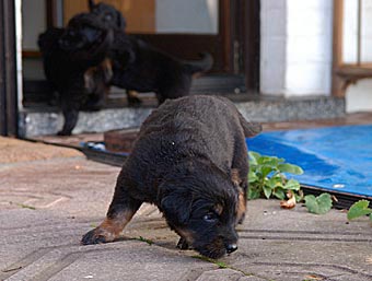 Die Welpen bekamen zum ersten Mal eingeweichtes Trockenfutter und machten den ersten Ausflug in den Wintergarten.