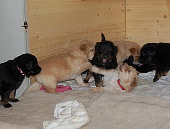 Nach jedem Ausflug versammeln sich alle Welpen wieder in der Wurfkiste,