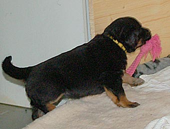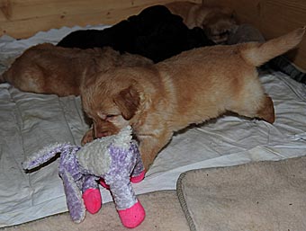 Immer öfter sieht man, wie die Welpen Spielzeug schütteln und umher tragen.