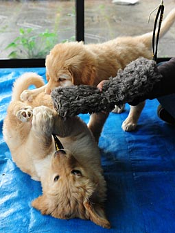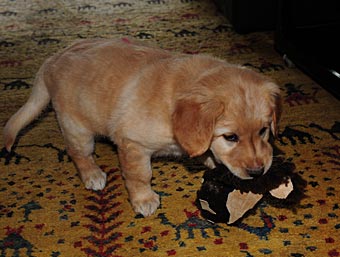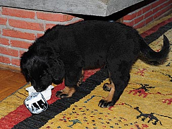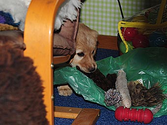 Bora entdeckte im Gästezimmer meine Welpenspielzeug-Vorräte, fand ein Stück Schaffell und schleppte ihre Beute ab.
