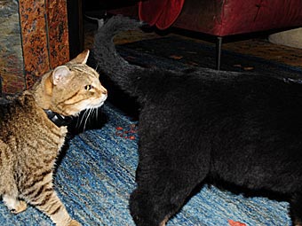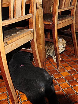 unten: Auf dem Schrank sitzt unsere Katze Lotte. < BeHappy war im Bad zu einer lockeren Schmuserunde aufgelegt ... |