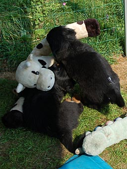 BeHappy und BigHenry untersuchen die neue Plüschkuh etwas genauer. |