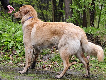 Ihre Ohren sind von korrekter Größe, hoch und hinten angesetzt und werden anliegend getragen. Ihr mittelblondes, schlicht gewelltes Haar ist von mittlerer Länge und zeigt korrekte Aufhellungen. Das Pigment ist gut durchgefärbt. Gangwerk, Winkelungen und Rutenhaltung sind korrekt.