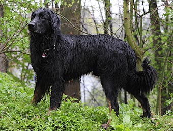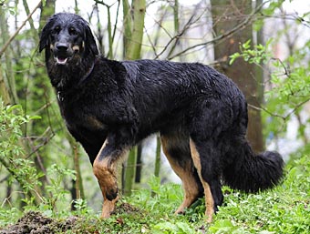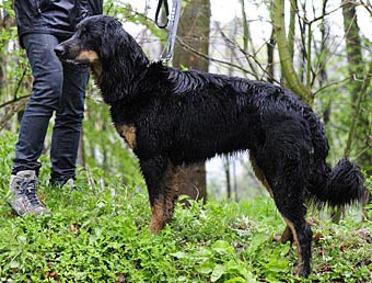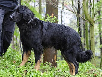 Ohransatz und -größe sind korrekt, der Behang wird anliegend getragen. Sein tiefschwarzes Haarkleid ist schlicht gewellt und von korrekter Länge. Die Marken sind mittelblond, das Pigment ist gut durchgefärbt. Winkelungen und Gangwerk sind korrekt.