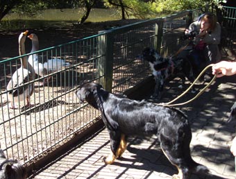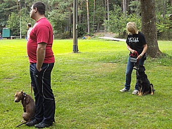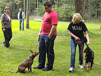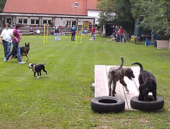 ... danach ging es im Slalom um die anderen Hunde und ihre Besitzer, erst mit Leine ...
