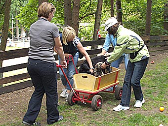 Anschließend ging es für alle Welpen jeweils zu zweit im Bollerwagen auf eine Rundfahrt auf dem Übungsplatz.