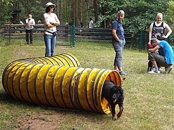 In der Welpenstunde in der 17. Woche war wieder der Kriechtunnel dran, der zur Hälfte durchhängt. Bei dem überlegt Bea immer erst mal, ob es nicht besser wäre aussen vorbei zu gehen, aber wir konnten sie doch überzeugen, dass sie auch duchhgehen kann :-))