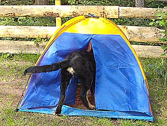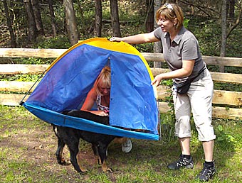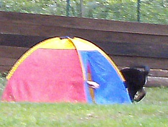 Nachdem Frauchen sich unter dem Zelt versteckt hat, musste Bea auf Zuruf zu ihr ins Zelt kommen,