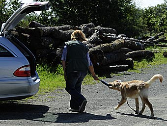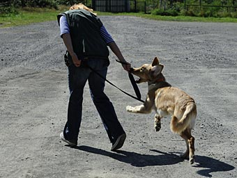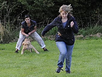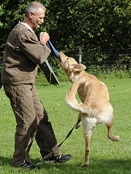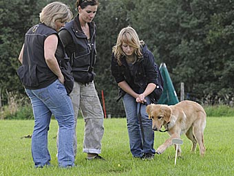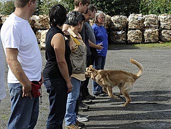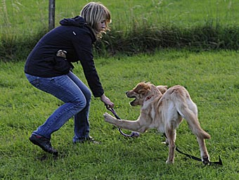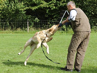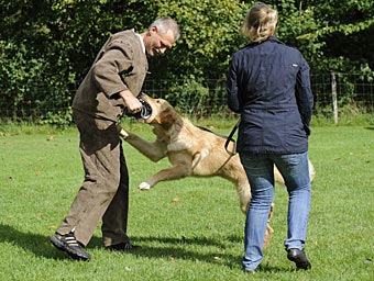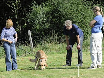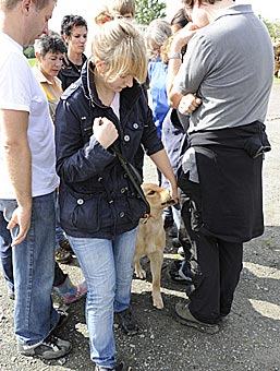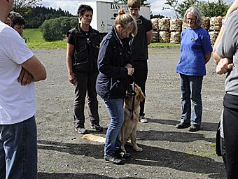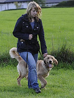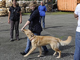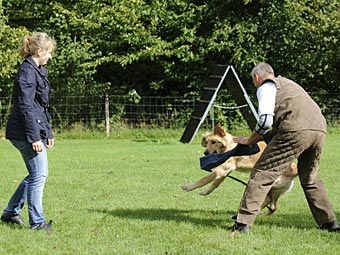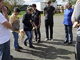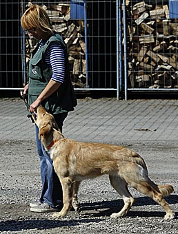 Zuerst wurde wieder ein Fährtendreieck abgesucht ... ... dann wurden erste Schritte zum "Fuß" geübt > |