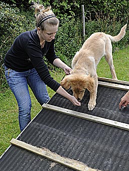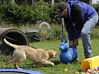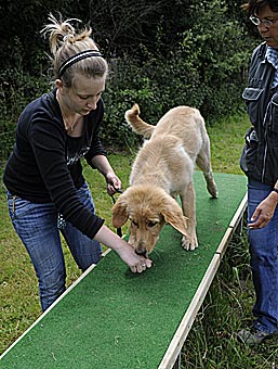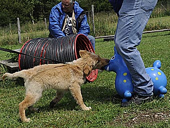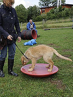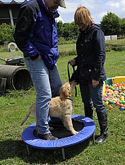 Während die anderen Welpen schon müde waren, hatte Bellis noch viel Spaß mit Wackelbrett, Trampolin und dem blauen Gummipferd