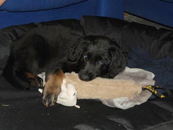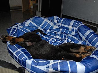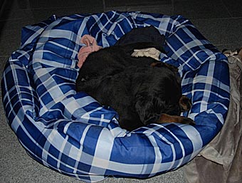 Nachts durfte Bogart es sich aussuchen, ob er in seiner Box schlafen möchte oder lieber vor dem Bett. Einmal in der Nacht hat er sein neues Herrchen dann ordentlich geweckt und ist zusammen mit ihm raus in den Garten, wo er brav sein Geschäft erledigte. Den Rest der Nacht konnten alle dann ruhig schlafen.
