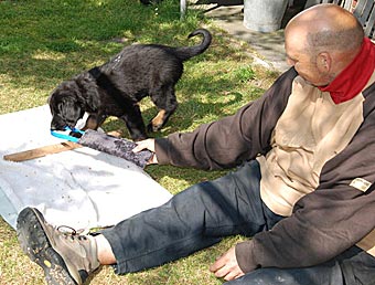 Einen ersten kleinen Ausflug hat Bogart auch schon gemacht: Auch bei Arbeiten im Garten ist er immer sehr interresiert und hilft fein mit. Gestern wurde seine Hütte weiter geschliffen ;-)) Den Schwingschleifer hat Herrchen ihm zwar schon gezeigt und auch einmal kurz angemacht, was ihn auch nicht weiter gestört hat. Aber dann hat Herrchen doch mit der Hand geschliffen, denn so viel Krach wollte er ihm dann doch nicht zumuten, obwohl ihm das scheinbar nichts ausmachte. Er schaute sehr interessiert hin und hat den Schwingschleifer auch genau untersucht. |