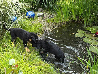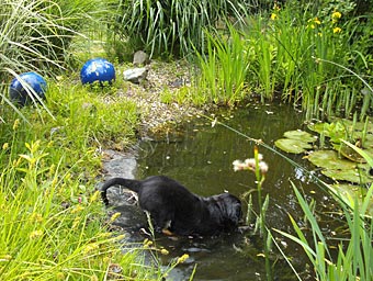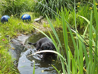 Als Happy das Biotop entdeckte, war sie ganz begeistert. Sie ging mit den Vorderpfoten hinein, rutschte mit den Hinterpfoten hinterher und stand auf einmal mitten drin. Frauchen musste sie raus heben, aber das fand sie überhaupt nicht schlimm - sie wollte sofort wieder hinein!
