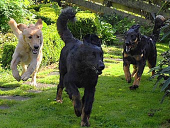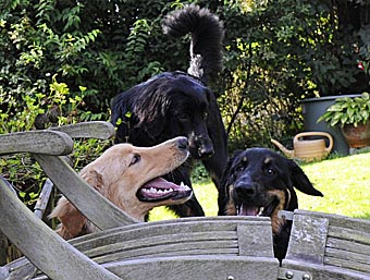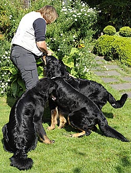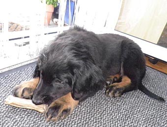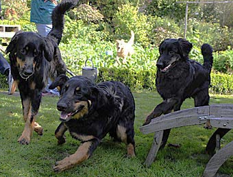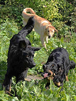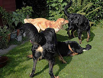 Henry ist inzwischen 3 Monate alt und wächst und gedeiht. Anfang der Woche war er beim Tierarzt zum impfen. Er hat einmal kurz gejunkt, dann war alles wieder gut. BeHappy und Paula waren natürlich auch dabei und genauso tapfer. Henry und Happy Lotte spielen natürlich immer noch für ihr Leben gerne zusammen. Doch auch mit allen anderen Hunden hat Henry überhaupt keine Probleme. Rennen, toben, Beine beißen, umfallen ... Spaß haben! Aber er bekommt auch schon viel Lob. Bei der RHS macht er sich hervorragend. Alle Schinkenwurst wurde bereits sehr zielstrebig gerettet. Er weiß mittlerweile auch,was Frauchen mit dem Kommando "Gib Laut" meint. Henry wird dann immer sehr aufgeregt und für jede Äußerung seinerseits wird er belohnt. So jedes 10. Mal kommt sogar ein WUFF zustande. Dann machen wir immer Party!