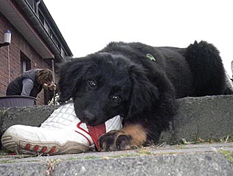 Henry bei der "Freien Rettungshundestaffel Krefeld" > Henry ist ein sanfter wilder Bursche, der immer gut drauf ist und alles ihm Angebotene mit Freude annimmt. Das Suchen von Personen macht ihm sehr viel Spaß. Nur Treppen und Abgründe sind nicht so ganz sein Ding. Aber mit ein bisschen Nachhilfe ging auch er mit Freude mit Frauchen in den Keller. Er war ganz stolz und erkundete alle neuen Räume. Danach ging Henry auch ohne Frauchen mit dem Wissen "Hei, ich kann's" alleine hinunter und herauf! Nun wird auf den unterschiedlichsten Treppen geübt. Bei den Rettungshunden trainiert er schon auf einem Leitersteg mit Aufstieg, Übergang und Abgang. Ähnlich wie der Steg beim Agility - nur eben aus Sprossen. Und er bekommt alle vier Füße super koordiniert ;-) Henry liebt Schmusetiere über alles. Er ist auch mit 6 Monaten immer noch gerne auf dem Schoß und selbst auf dem Arm fühlt er sich noch richtig wohl. Er ist ein Casper und ein Clown und bringt seine Familie immer wieder zum Lachen. Er macht alles mit und ist immer cool und gelassen. Spielen mit anderen Hunden ist allerdings der absolute Renner. Egal wie groß oder klein, alt oder jung, eine Gruppe oder einzelner Hund - er liebt das ausgelassene Spiel mit Artgenossen. Auf dem Hundeplatz hört er wie 'ne Eins (Frauchen hat wohl auch immer super Leckerchen dabei!). Aber das Wichtigste ist, dass er alles mit unendlich viel Leidenschaft macht und sehr, sehr viel Spaß dabei hat! |