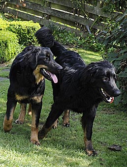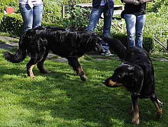 Frauchen hat seit Neujahr seine Hovifreundin Bonnie in Pflege. Henry findet das echt toll. Den ganzen Tag Beine-beiß-, und Ohr-langzieh-Spiele. Nur wenn er etwas im Mund hat, kann sie es ihm nicht gönnen. Sie steht vor ihm, guckt ihn an (ganz ruhig, aber schon drohend) und Henry sagt: "Na gut, nimm du es" und geht. Im Garten macht er allerdings ein Spiel daraus. Er rennt dann los und sie hinterher. Henry liebt diese Spiele. Das ist dann wohl auch der einzige Moment, wo er seine Ohren auf Durchzug hat.