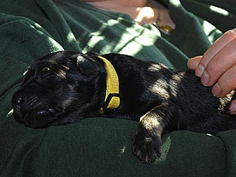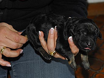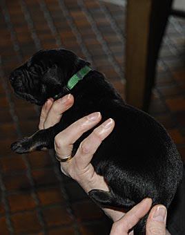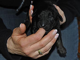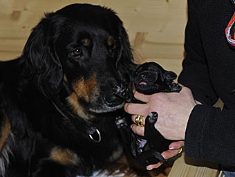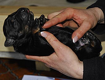 Bei der Wurfabnahme kam "unsere" Chili als erste dran. Mama Carla passt genau auf, was mit ihrer Tochter da geschieht.