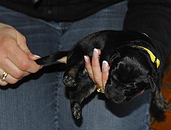 Bei allen Welpen wurden die Ruten gründlich abgetastet. Hier bei den Herren mit dem gelben (Crawall) und grauen (Carlos) Halsband.
